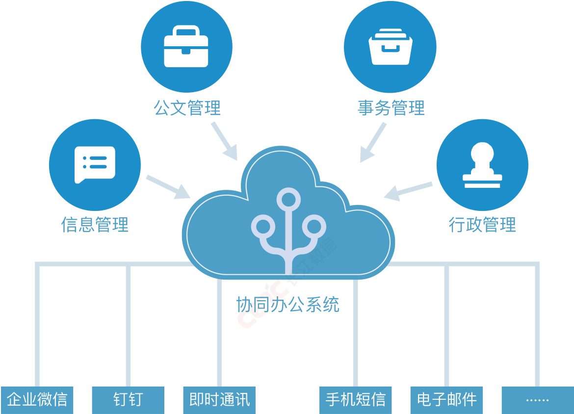 系统主要由事务管理、公文管理、行政管理、信息管理等子系统构成提供企业微信、钉钉、即时通讯、手机短信、电子邮件等多种信息传输、消息传递方式,使相互孤立的系统应用联结为一体,为办公人员构建信息集中发布、资源高度共享的协同工作环境。