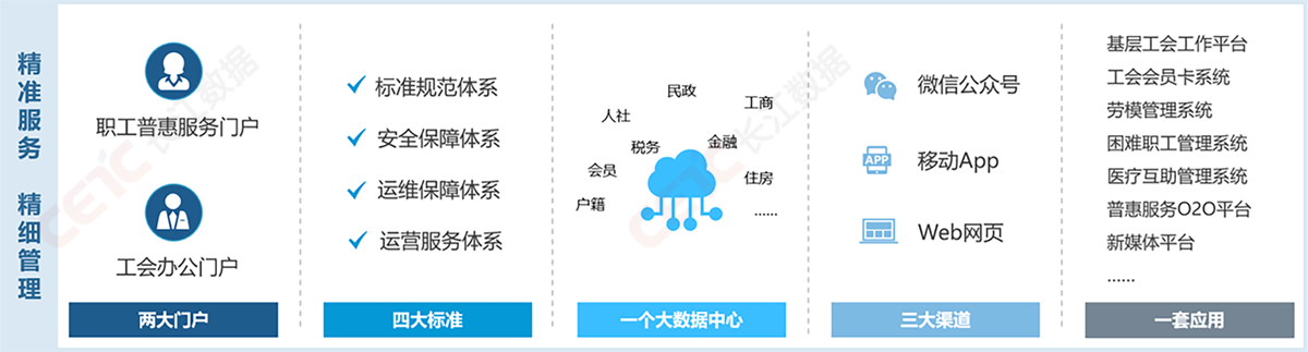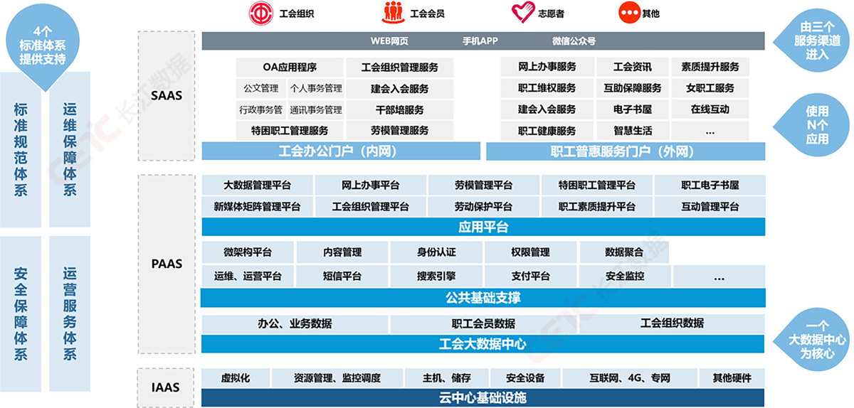 以推进“互联网+”工会建设、更好服务职工为重点,以沟通线上线下,利用移动互联技术、 大数据、人工智能、云计算、区块链等技术,打造一套由“一个大数据中心、两大门户平台、三个服务通道、四个标准体系、N个应用支撑”的“互联网+”智慧工会新模式。